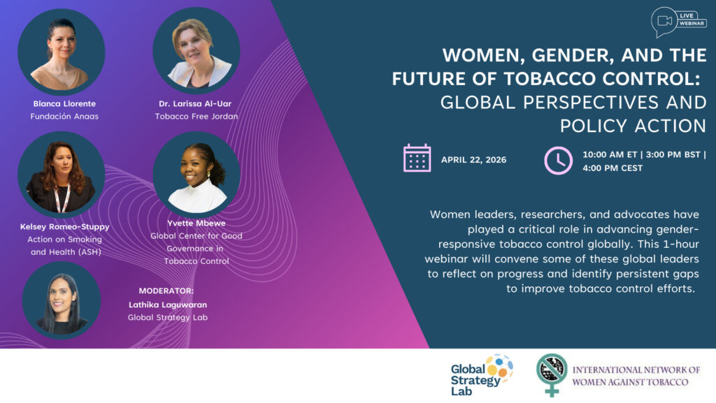 Co-led by the Global Strategy Lab (GSL) and the International Network for Women Against Tobacco (INWAT), the discussion will reflect on progress to date, identify persistent gaps, and explore concrete actions policymakers, researchers, and advocates can take to strengthen tobacco control efforts.