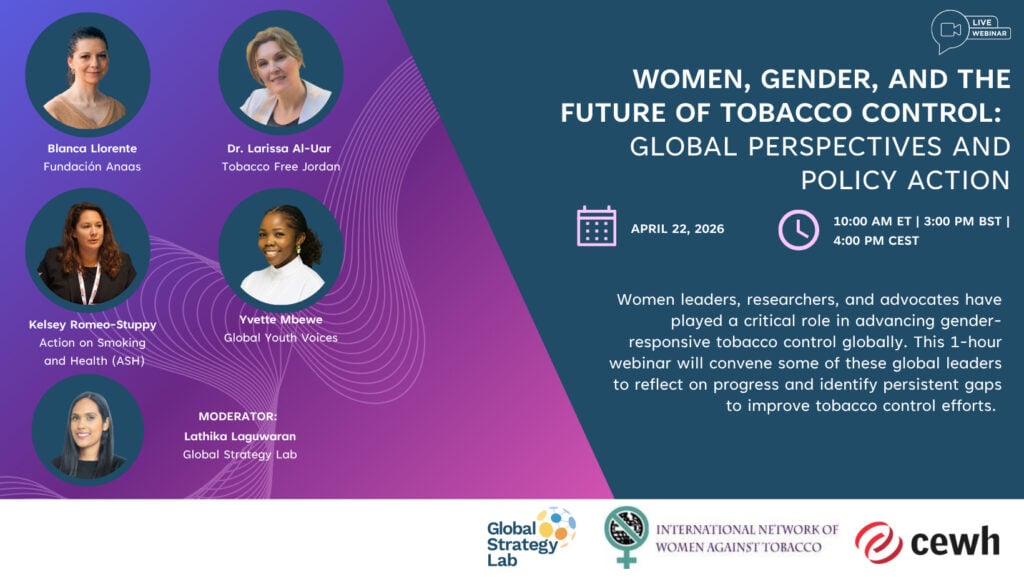 On Wednesday, April 22, the Global Strategy Lab (GSL), in collaboration with the International Network for Women Against Tobacco (INWAT) and the Centre of Excellence for Women’s Health (CEWH), hosted a webinar titled Women, Gender, and the Future of Tobacco Control: Global Perspectives and Policy Action. This event brought together a powerful group of women leaders in the tobacco control space.